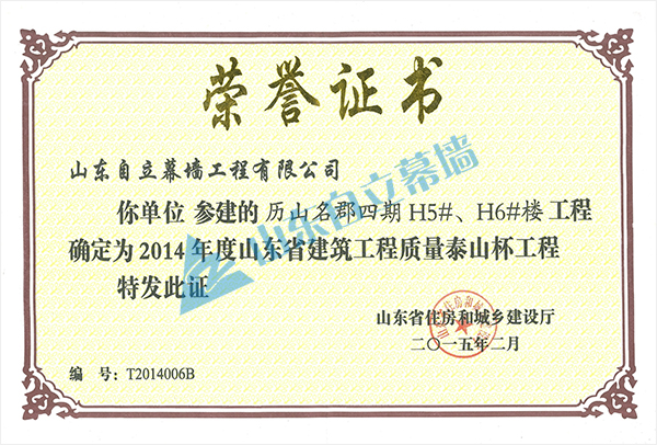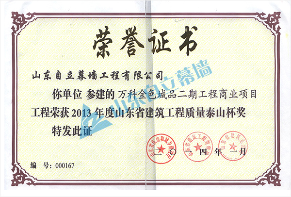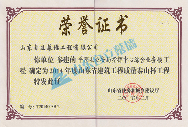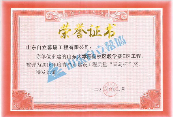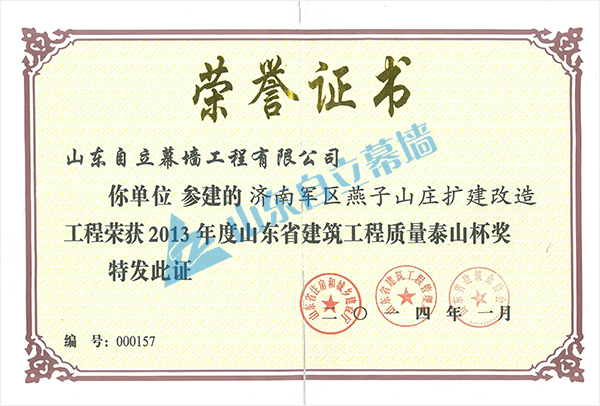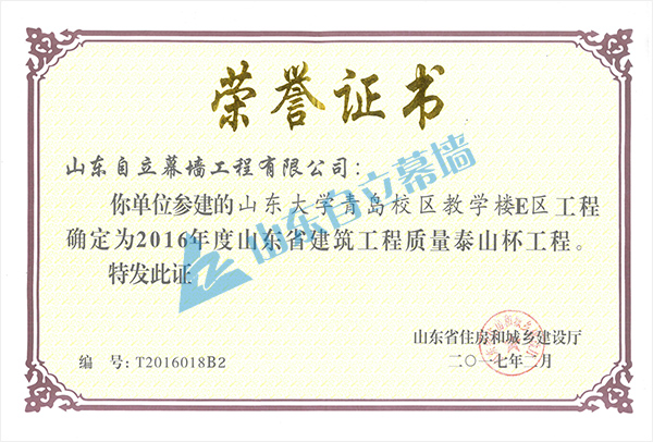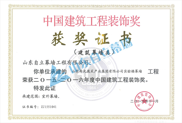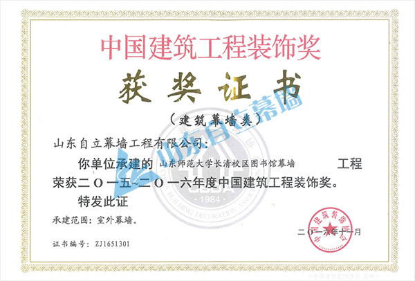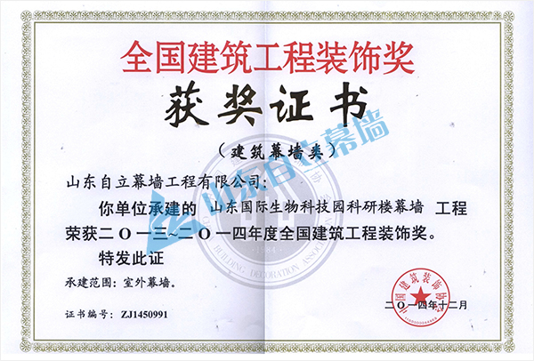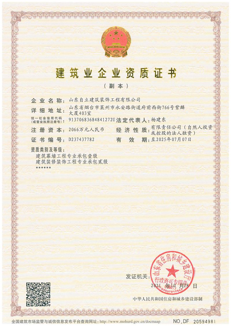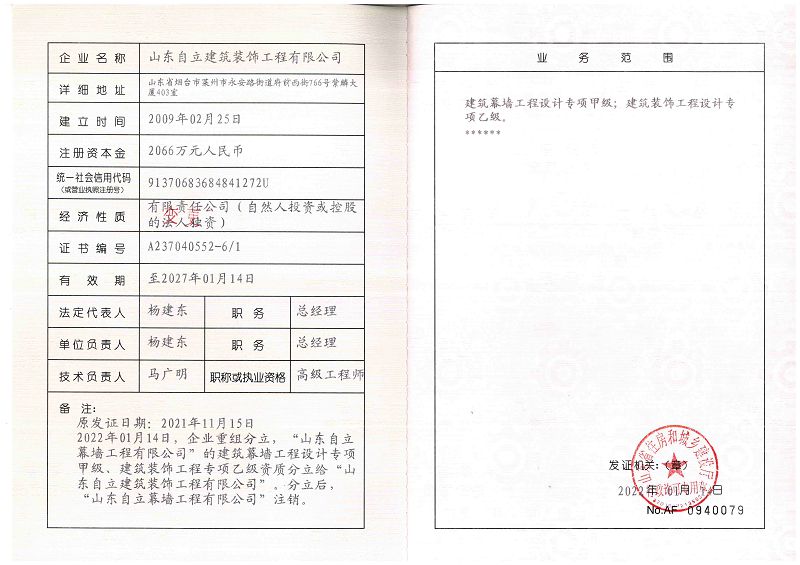 山東自立建筑裝飾工程有限公司具有國(guó)家建設(shè)部頒發(fā)的金屬門窗專業(yè)承包壹級(jí)、建筑幕墻工程專業(yè)承包壹級(jí)、設(shè)計(jì)專項(xiàng)甲級(jí)資質(zhì),同時(shí)具有建筑裝飾裝修貳級(jí)、鋼結(jié)構(gòu)叁級(jí)資質(zhì)。